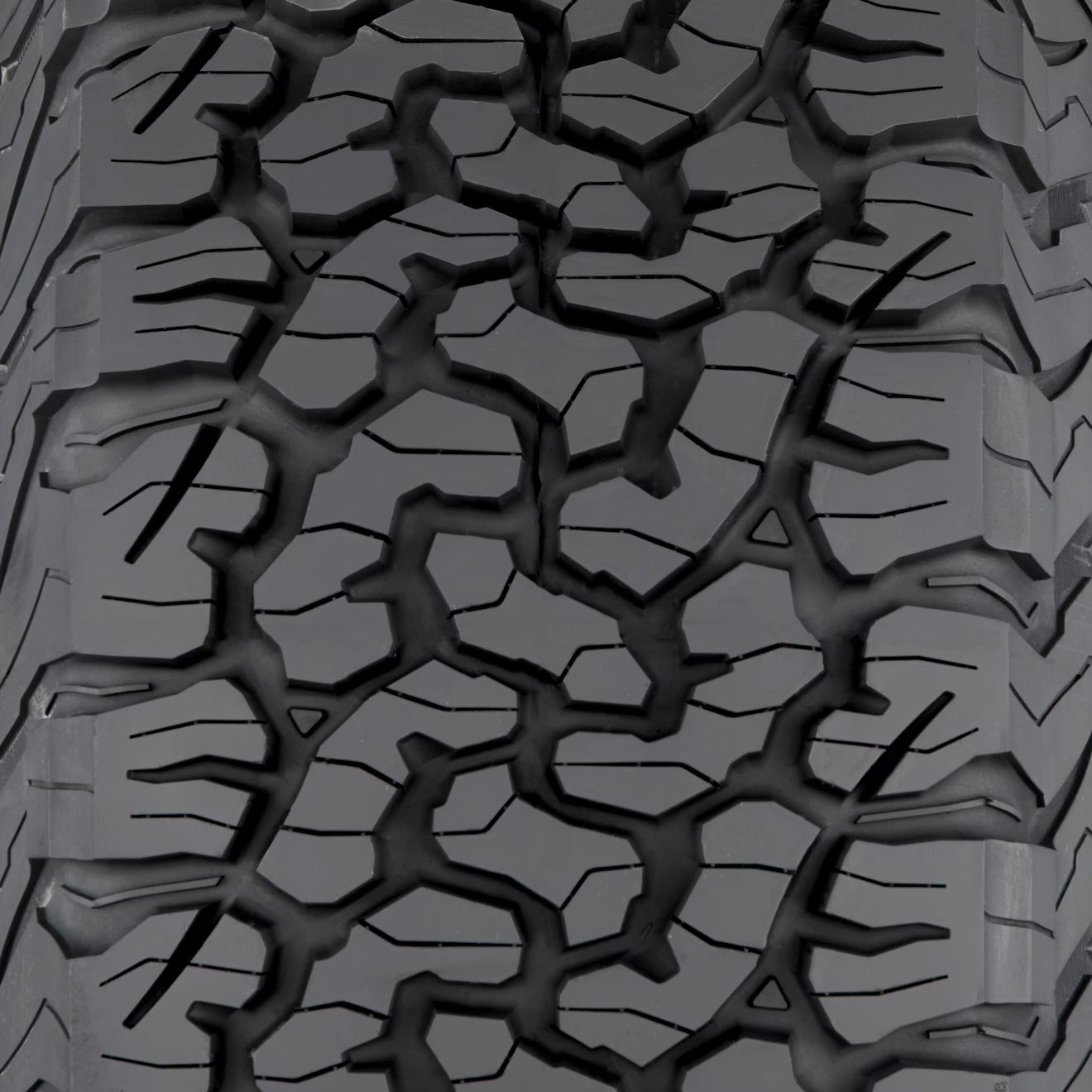 All-Terrain T/A KO2 tires feature a racing derived cut-, chip- and tear-resistant tread compound that delivers longer life (up to 2 times the previous generation tire's treadwear on gravel roads). The compound is molded into an aggressive, computer optimized, high-void all-terrain pattern with interlocking tread blocks, innovative siping and multiple loose object ejection features to combine off-road durability and traction with on-road handling and acceptable noise.